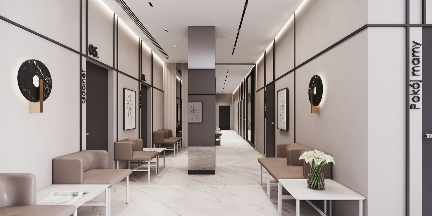 Projekt wnętrz kliniki medycznej w Warszawie.