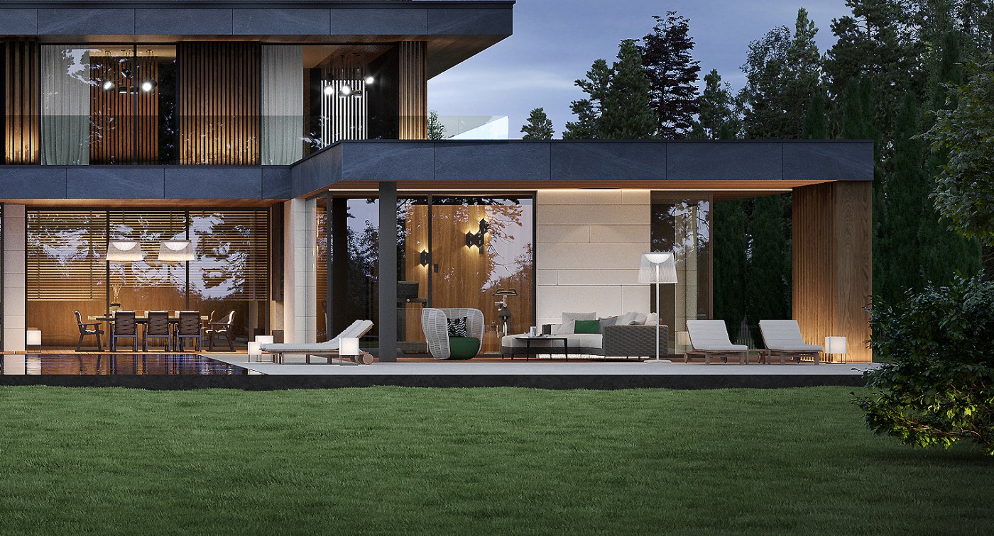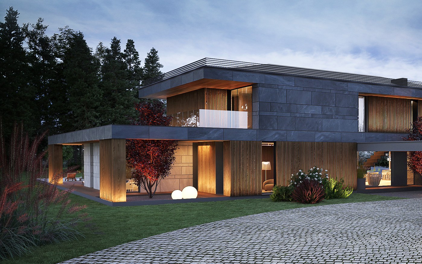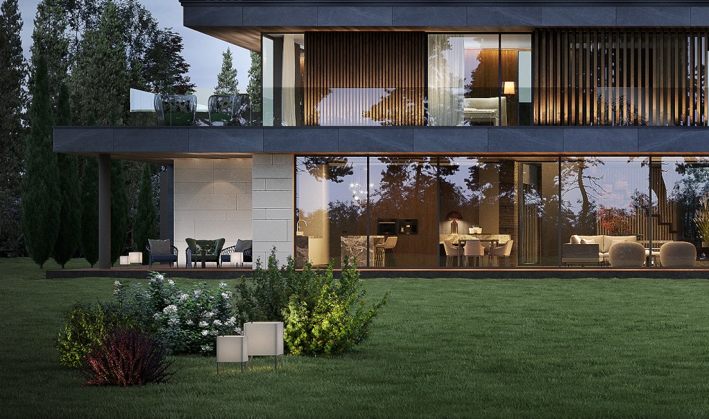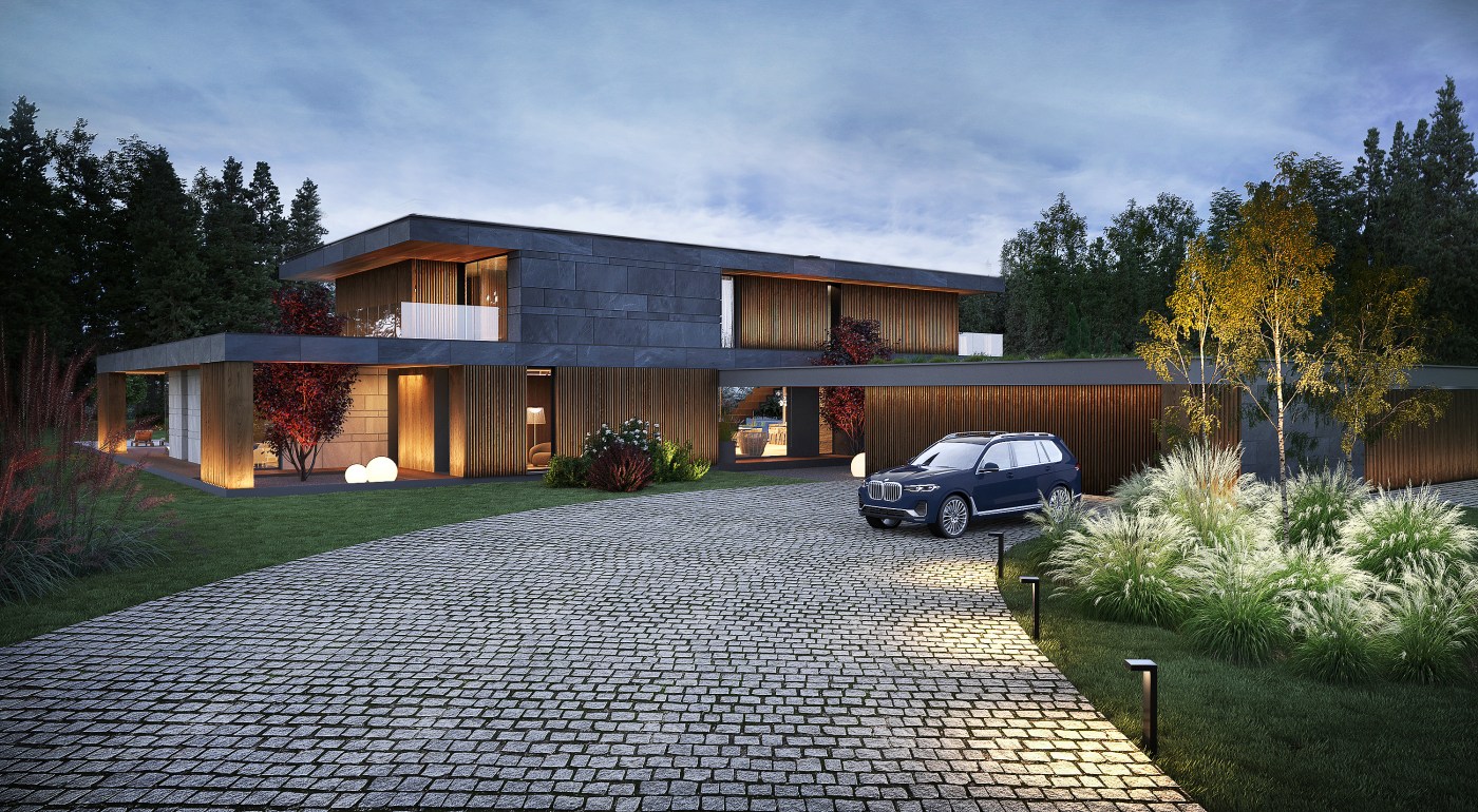 Willę o powierzchni około 500 m2 charakteryzuje prosta forma. Eleganckie materiały, efektowne przeszklenia oraz współczesny detal dodają bryle budynku nowoczesnego sznytu. Elewacje zaprojektowano z zastosowaniem naturalnych materiałów: drewna, grafitowego kamienia oraz piaskowca, korespondujących z otaczającym parkiem.