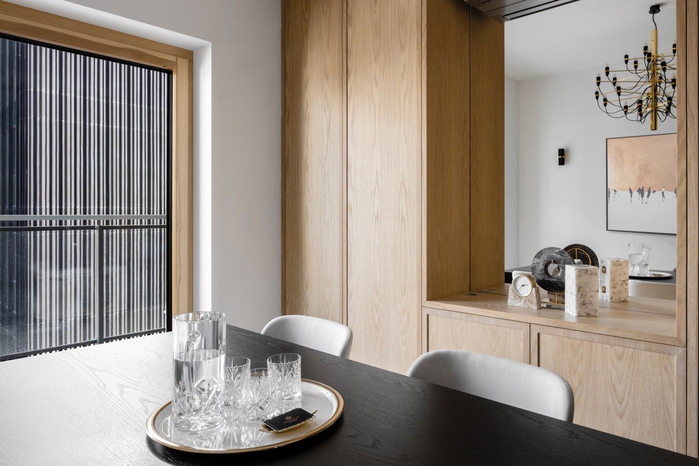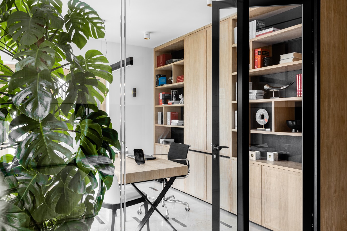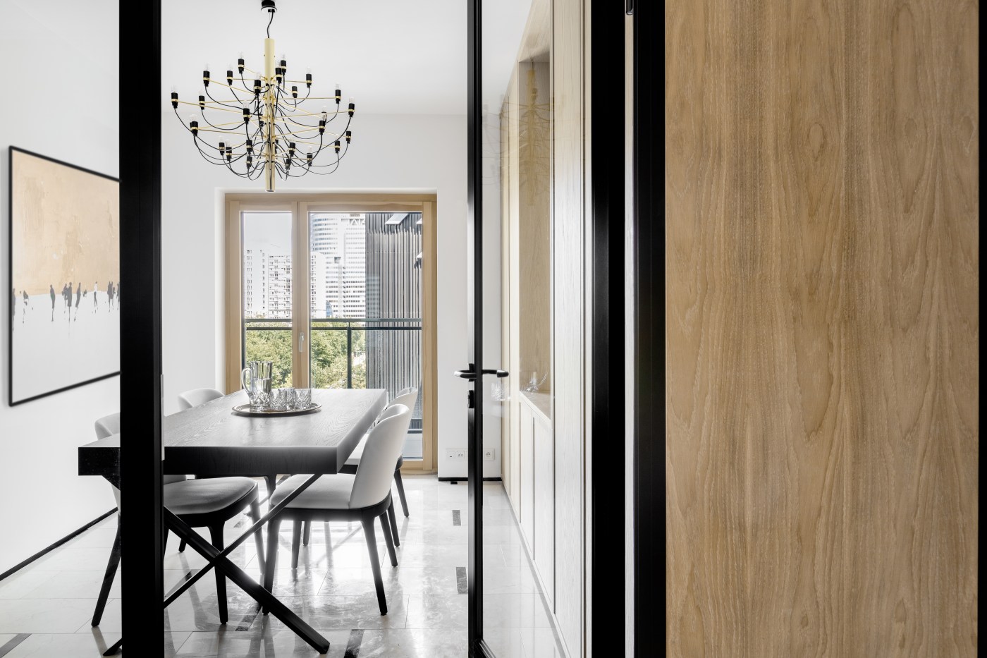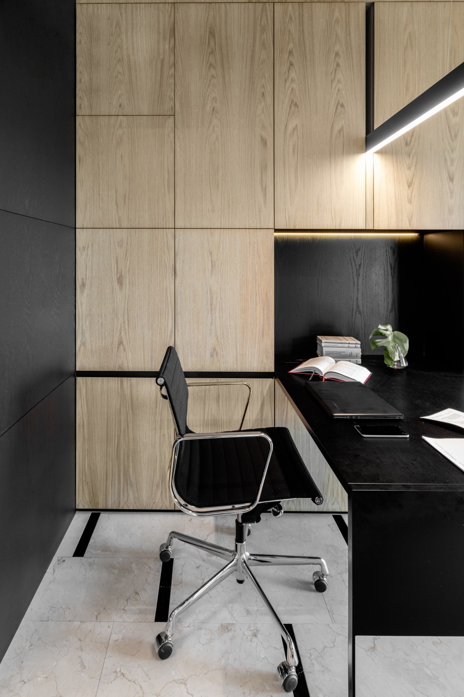 Aranżacja wnętrza kancelarii adwokackiej była inspirowana elegancką architekturą Mennica Residence, w której usytuowana jest inwestycja, w efekcie czego powstała harmonijna spójność wnętrza z budynkiem. W projekcie pojawiły się szlachetne materiały: kamień naturalny, dymione lustra, elegancka czerń, złote detale. Przestrzeń kancelarii została zmyślnie powiększona poprzez usunięcie tradycyjnych ścian działowych, w miejsce których pojawiły się systemowe ścianki szklane, nadające kancelarii ciekawy i nowoczesny wygląd oraz dające światło dzienne dla całego biura.